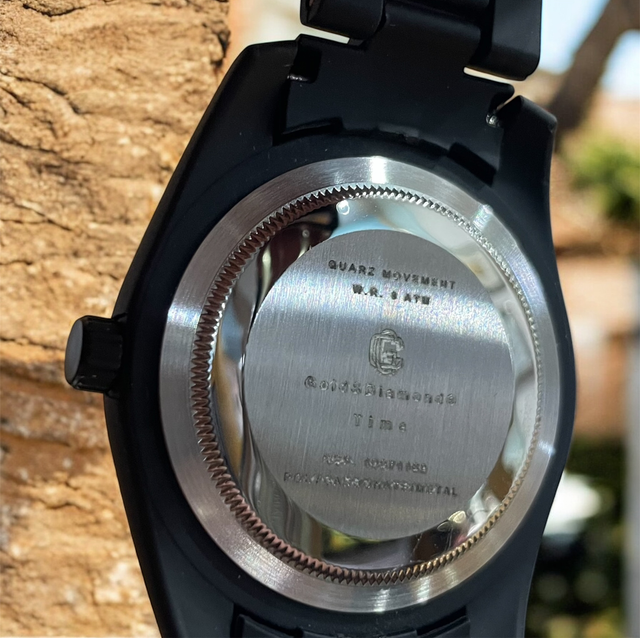 cassa e bracciale policarbonato. Colore nero Quadrante verde numeri arabi lancette spade.Fondello e chiusura metallo acciaio. WR 3 ATM - Movimento quarzo data.